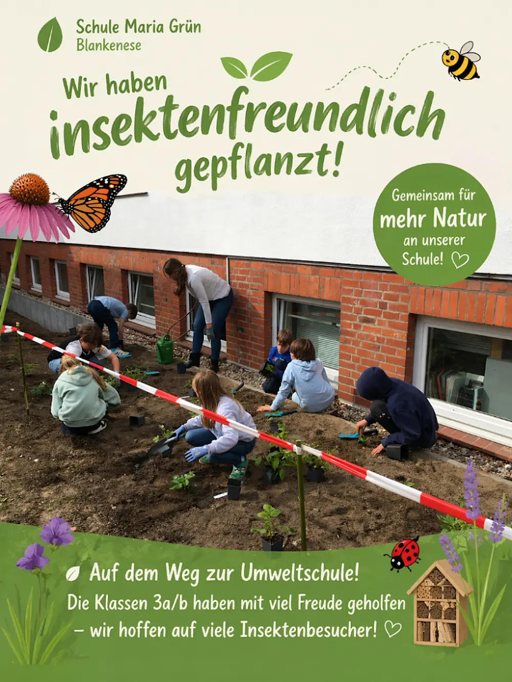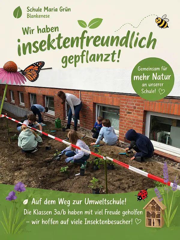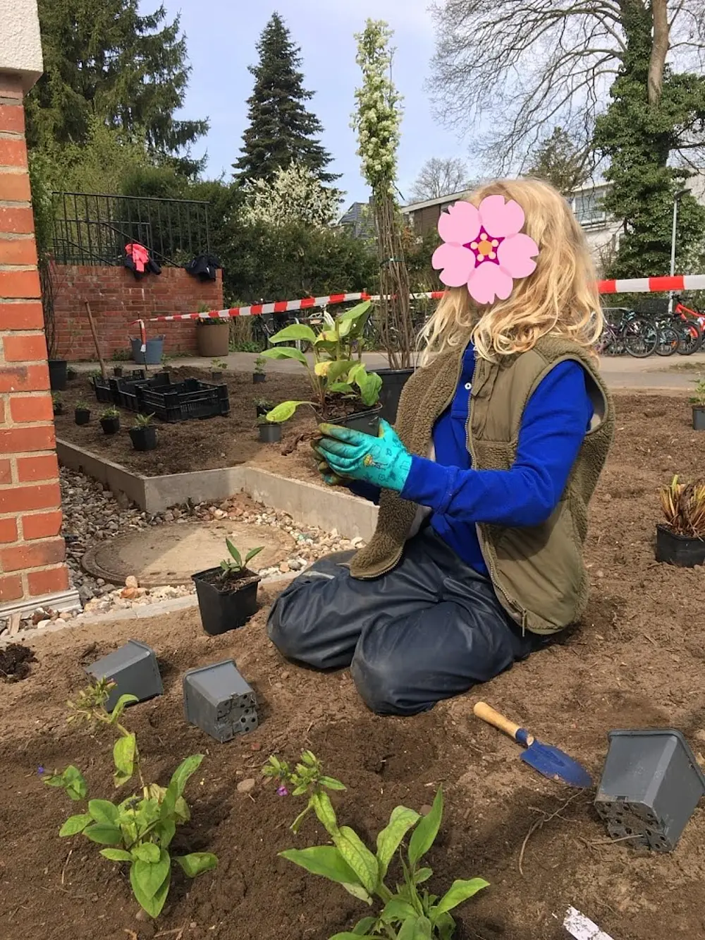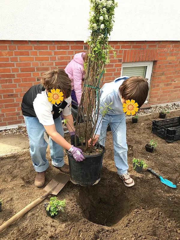In einer gemeinsamen Aktion haben Schülerinnen und Schüler der 3. Klassen mit Referendarinnen, Lehrerinnen und Lehrern zunächst den Lesegarten in Schuss gebracht und dann die durch Drainage-Verlegung neu entstandenen Flächen vor der Schule bepflanzt. Statt eines bloßen Rasenstreifens haben wir uns bewusst für eine abwechslungsreiche Bepflanzung entschieden. Die Stauden sollten nicht nur schön aussehen, sondern zum Standort passen, heimisch und insektenfreundlich sein. Die zweitägige Aktion war ganz schön anstrengend - hat aber auch riesig viel Spaß gemacht! Nun freuen wir uns auf allerlei sechsbeinige Gäste!