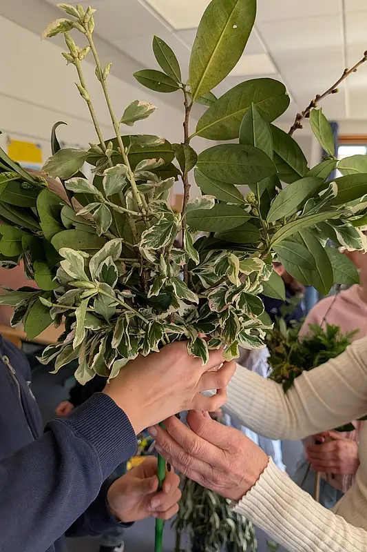 Die Schülerinnen und Schüler haben Stöcke und Grünschnitt mitgebracht - auch Blütenzweige und Blumen waren dabei - und sie dann in den Klassen zu Palmstöcken gebunden. Beim Binden und Verzieren gab es zum Glück die Hilfe von Eltern - oder von den Paten aus der 4. Klasse. Vielen Dank - die Ergebnisse können sich sehen lassen!