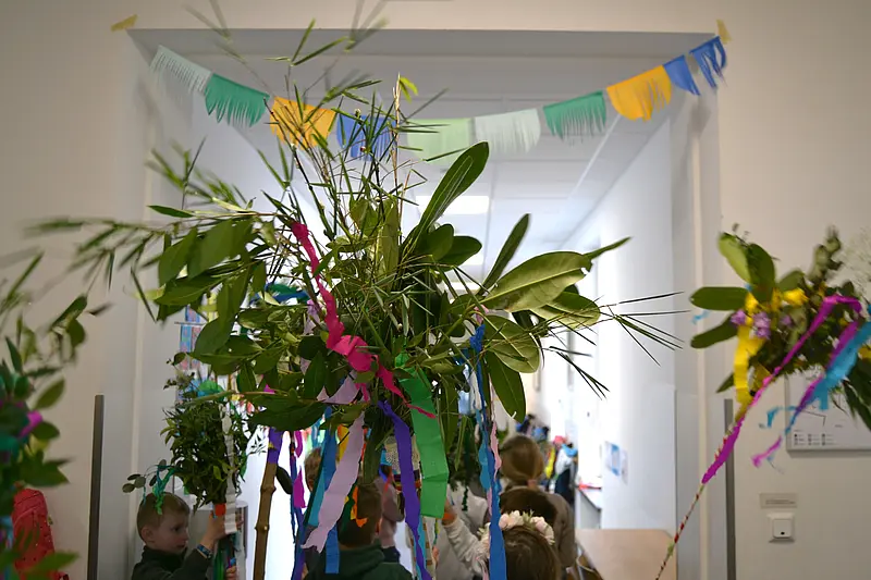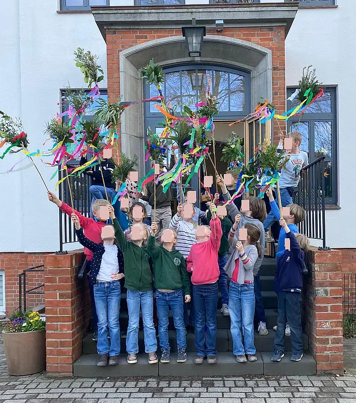 Die Palmstöcke sind fertig. Und wie schön sie geworden sind! Begeistert laufen die Kinder mit ihren fertigen Kunstwerken durch den Schulflur in Richtung Schulhof. Jetzt noch schnell ein paar Klassenfotos als Erinnerung aufnehmen!